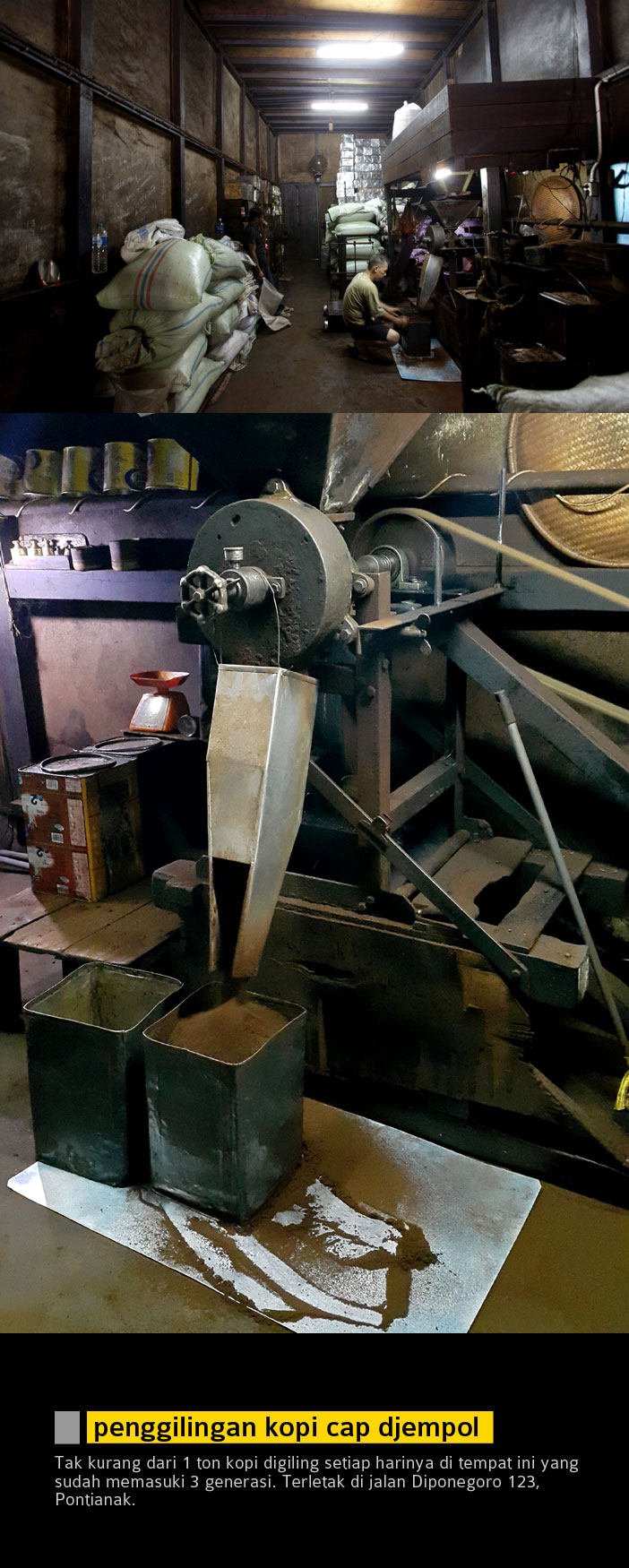 Ruangan dengan pencahayaan minim dan suara mesin grinder yang digerakan oleh motor penggerak dan partikel kopi yang halus memenuhi tempat ini. Asiong harus segera menyelesaikan tugasnya menggiling kopi yang mesinnya tak pernah berhenti dari pagi hingga sore. Sekitar 1 ton Djempol menggiling kopi setiap harinya, sejumlah itulah yang nantinya akan didistribusikan ke berbagai tempat termasuk di luar kota Pontianak.