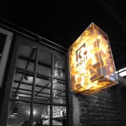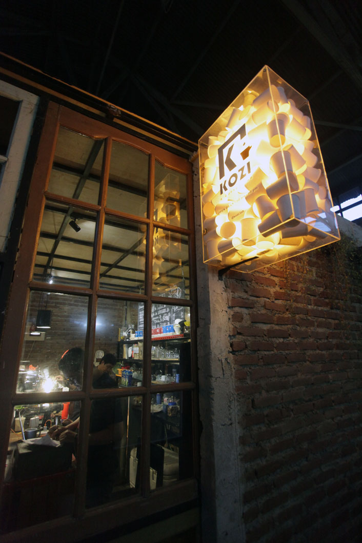 Rustic Industrial Warehouse. Desain eksterior-nya saja sudah menarik perhatian dengan beragam kusen bekas berwarna-warni yang dirangkai sebagai kesatuan untuk dinding bagian luar. Sedangkan aksen utama adalah pintu masuk berwarna merah dengan sorotan kap lampu dibagian atasnya. Sementara di luar ditempatkan beberapa meja dengan tempat duduk berupa tong bekas. Satu lagi, cangkir-cangkir kertas ditumpuk begitu saja dalam kotak tembus pandang yang terbuat acrylic dengan tulisan dan logo Kozi yang disinari lampu kuning dari bagian dalam.