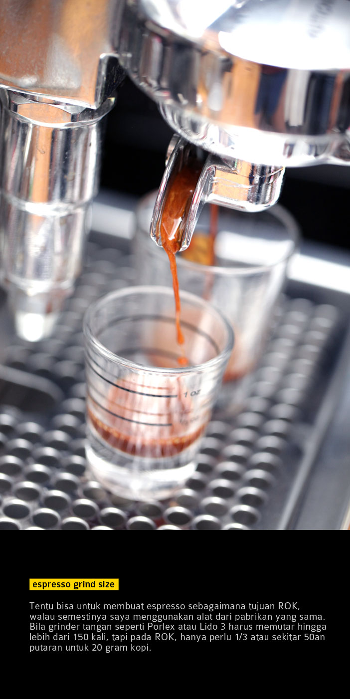 Espresso. Semestinya saya menggunakan alat espresso ROK, tapi yang ada hanya mesin espresso Rocket Evoluzione, maka jadilah saya mencobanya pada mesin ini. Intinya, tidak ada kesulitan untuk ROK dalam menggiling dengan setting mesin espresso.