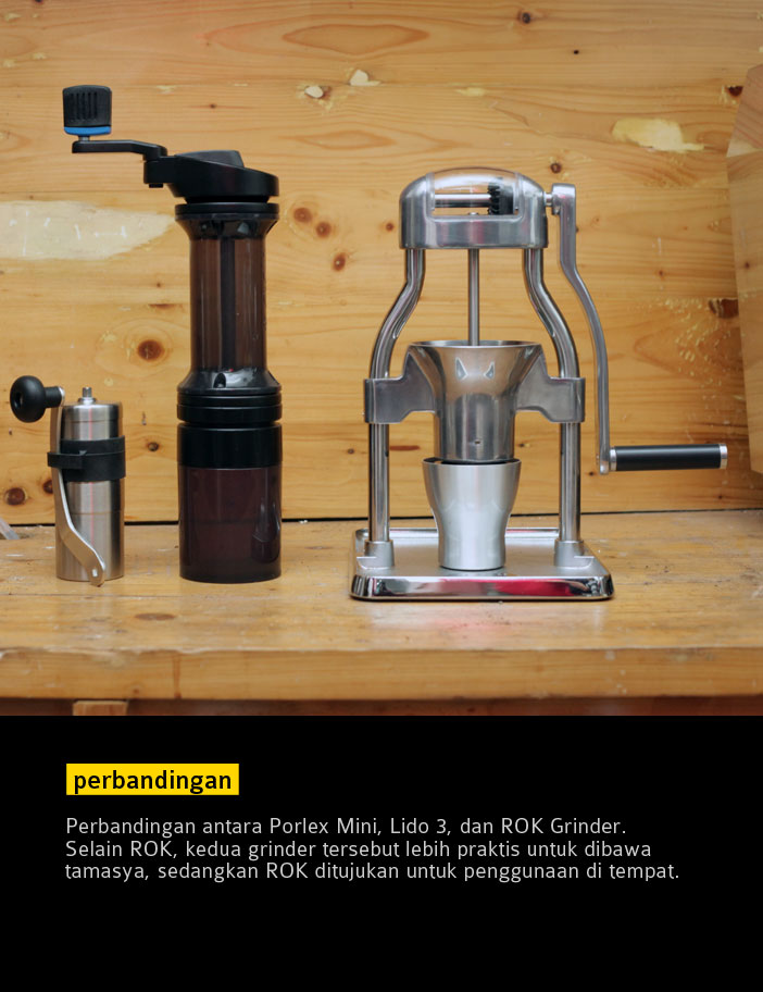 ROK grinder memang tidak portabel atau tak praktis untuk dibawa jalan-jalan karena bentuknya yang jauh lebih besar. Didesain dan diproduksi oleh perusahaannya untuk menjadi pendamping alat pembuat espresso manual, tapi tentu saja bisa digunakan untuk berbagai keperluan menyeduh kopi lainnya.