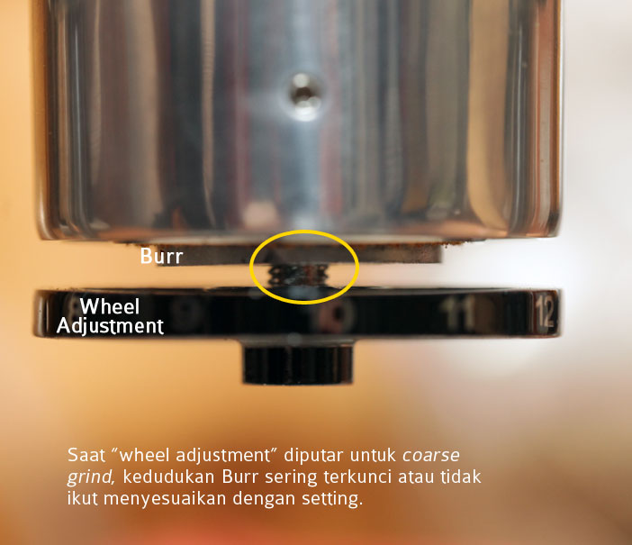 Kejadian ini terutama pada saat setting terhalus di mana kedudukan burr berada di bagian atas dan hanya diam saat memutar wheel adjustment. Saya mengganti pegas atau per yang lebih kuat, tapi problem masih tetap sama karena burr masih engan turun mengikuti putaran wheel. Solusi darurat adalah mengetuk burr dari bagian hopper dengan menggunakan obeng agar burr bisa terlepas bebas dan kembali melakukan penyesuaian awal.