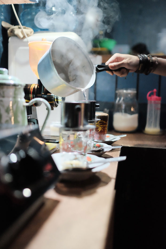 Tak ada peralatan kopi super mahal di Warung Kopi Imah Babaturan, apalagi mesin espresso nan gemerlap. Di sini hanya ada sebuah kompor gas, panci air aluminium, dispenser air mineral dan grinder kopi biasa. Hanya itu yang mereka butuhkan untuk membuat 3 menu kopi yang tersedia di sini, tubruk, seduh Vietnam Drip, serta kopi susu. Semuanya varian arabika dari salah satu roastery di Bandung, dan eh, satu lagi tongseng mereka yang menggenapi perjalanan ke salah satu warung kopi di kota Bandung.