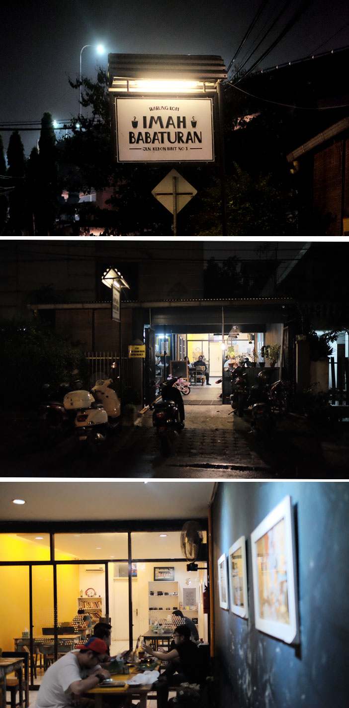 Kombinasi antara kopi dan tongseng dan menu rumahan lainnya seperti nasi goreng, atau gulai ayam, hanya bisa Anda rasakan di Warung Kopi Imah Babaturan, di jalan Kebon Bibit no. 3, kota Bandung.