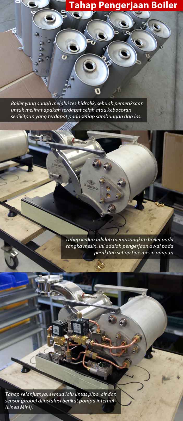 Saya melihat jajaran mesin espresso yang sebagian besar masih menggunakan sistem piston atau tuas untuk mengalirkan tekanan pada group head. Selama kurang lebih 12 tahun La Marzocco menggunakan sistem boiler yang dipasang secara vertikal, sebelum pada tahun 1939 mereka mematenkan kedudukan horizontal yang digunakan hingga saat ini.