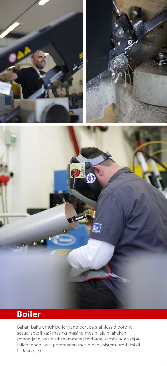 Pembuatan Boiler. Tapi pengerjaan tahap paling awal adalah pemotongan bahan baku untuk boiler yang menggunakan material stainless. Operator mengoperasikan mesin Shark 281 SX1 yang pisaunya berputar dengan kecepatan tinggi pada pipa stainless yang dipotong seusai dengan spesifikasi masing-masing mesin espresso.