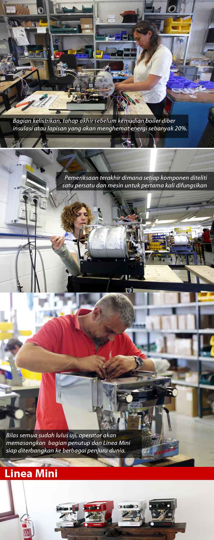 Pada ruang perakitan mesin GS3 dan Linea Mini saya melihat bahwa mayoritas para pekerja adalah perempuan yang dengan penuh konsentrasi mengerjakan satu bagian khusus yang ditugaskan oleh kepala produksi. Satu hal yang menarik bahwa semua karyawan di La Marzocco akan mendapatkan giliran untuk merasakan bekerja di ruang produksi, termasuk para staf di belakang meja.