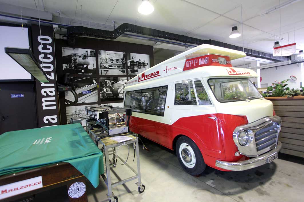 Sebuah ruangan dengan luas sekitar 100 meter berlantai keramik merah bata merupakan sebagian besar sejarah perusahaan yang berdiri sejak tahu 1927 yang dulunya bernama l’Occicina Fratelli Bambi dan mesin yang pertama kali diproduksi dinamakan La Marzocco.