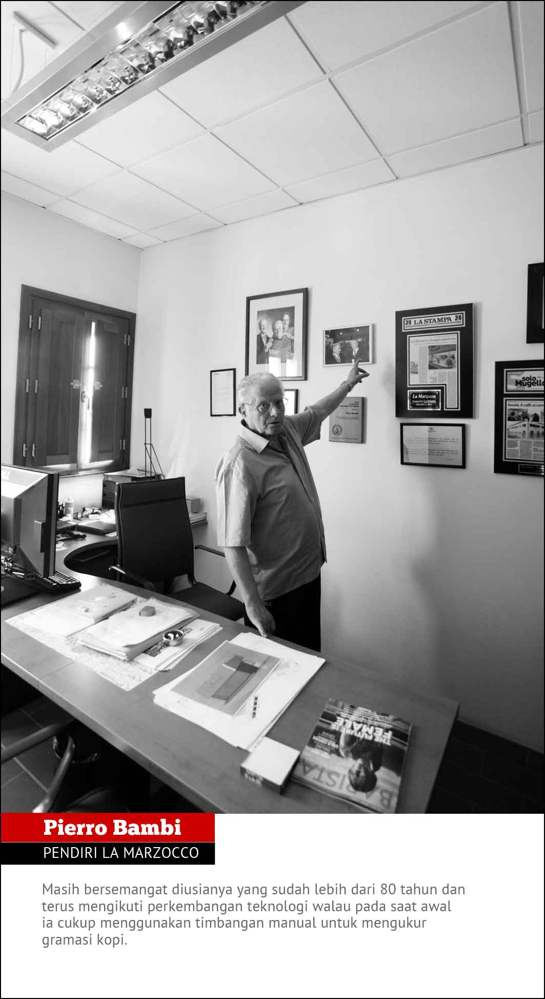 Di usianya yang sudah lebih dari 80 tahun, jarang-jarang Pierro Bambi hadir di fasilitas produksi La Marzocco yang kemudian mengundang saya untuk sejenak berbincang di ruang pribadinya. Pierro adalah salah seorang penerus perusahaan pembuat mesin espresso La Marzocco yang berlokasi di “kecamatan” Scarperia, sebuah wilayah di Tuscany, Florence. Wajahnya tak pernah lepas dari senyum, berbicara dengan halus sambil mengenggam erat tangan saya serta megucapkan selamat datang di keluarga besar La Marzocco. La Famiglia, atau keluarga sebuah kata yang nantinya seringkali saya dengar disebutkan oleh hampir semua karyawan selama dua hari berada di fasilitas produksi mereka.