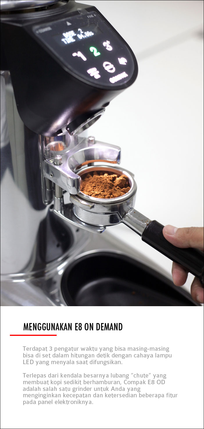Bagi yang sudah terbiasa menggunakan grinder merek Compak, secara garis besar hampir tak ada perbedaan dari bentuk fisiknya. dari mulai K3, K6 hingga E8 On Demand. Kesamaan antara lain bisa terlihat dari bean hopper atau tempat biji kopi yang tutupnya selalu mudah lepas, bean separator, hingga stick adjustment yang tak jauh berbeda dari model pendahulunya.