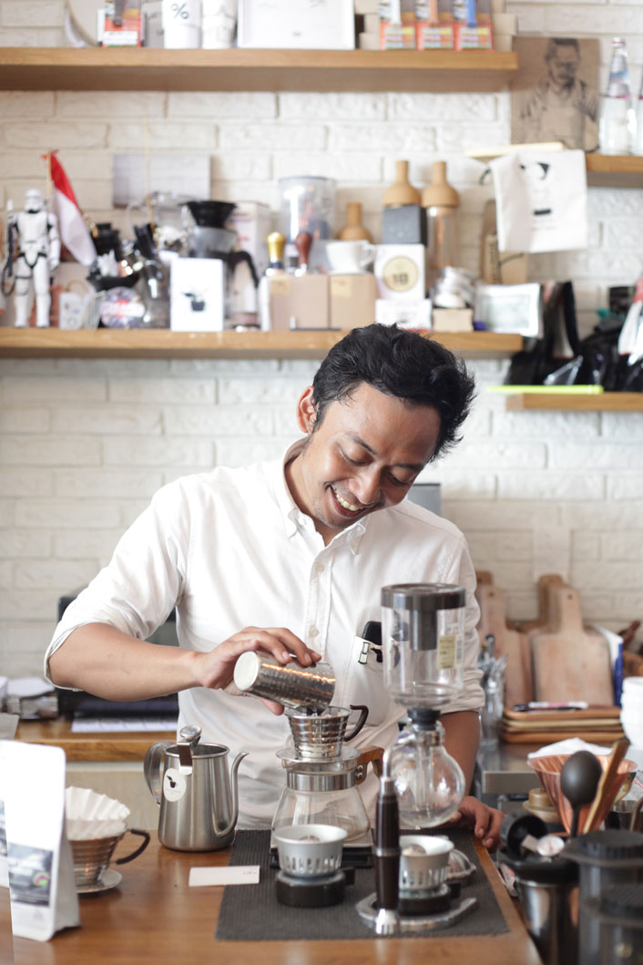 Ruangan seluas 130 meter dengan pintu masuk berwarna kuning ini berbalut warna putih dengan tempat duduk yang di tata sedemikin rupa sehingga mata pengunjung bisa dengan mudah menyaksikan langsung aktivitas para Barista di belakang bar.