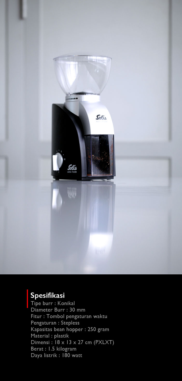 Tentang Solis dan Konstruksi Scala. Perusahaan berbasis di Swiss yang sudah berusia lebih datu 1 abad ini bukan hanya memproduksi alat penggiling kopi, tapi juga berbagai alat keperluan rumah tangga seperi juicer dan pengering rambut. Di Indonesia, Solis dipasarkan oleh Otten Coffee dengan harga jual 2 jutaan saat tulisan ini dipublikasikan.