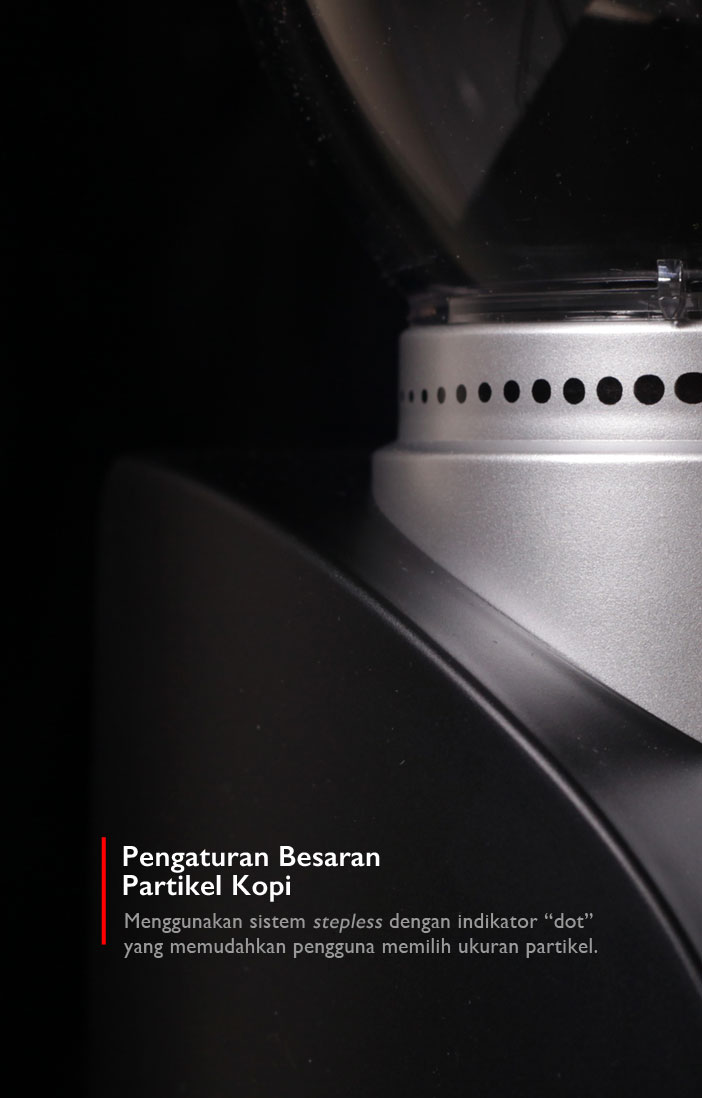 Tak ada switch on/off, karena Scala menggunakan tombol pengatur waktu yang terdapat di sebelah kiri untuk mengaktifkan grinder yang hanya dibekali daya listrik 180 watt.