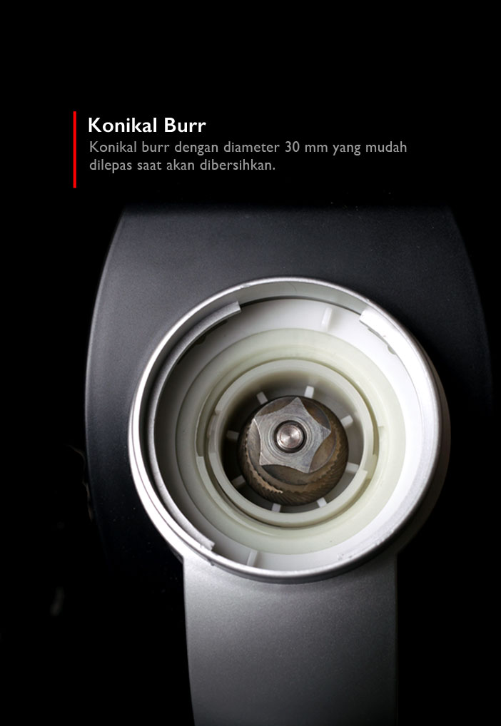 Fitur Utama. Mulai dari bean hopper atau kontainer penampung biji kopi yang bisa memuat 250 gram, walau tak dilengkapi dengan bean catcher (untuk menutup akses biji kopi ke bagian burr), Scala sudah dilengkapi dengan sebuah plastik hitam di bagian bawah hopper berfungsi agar biji kopi tak memantul saat alat ini dioperasikan.