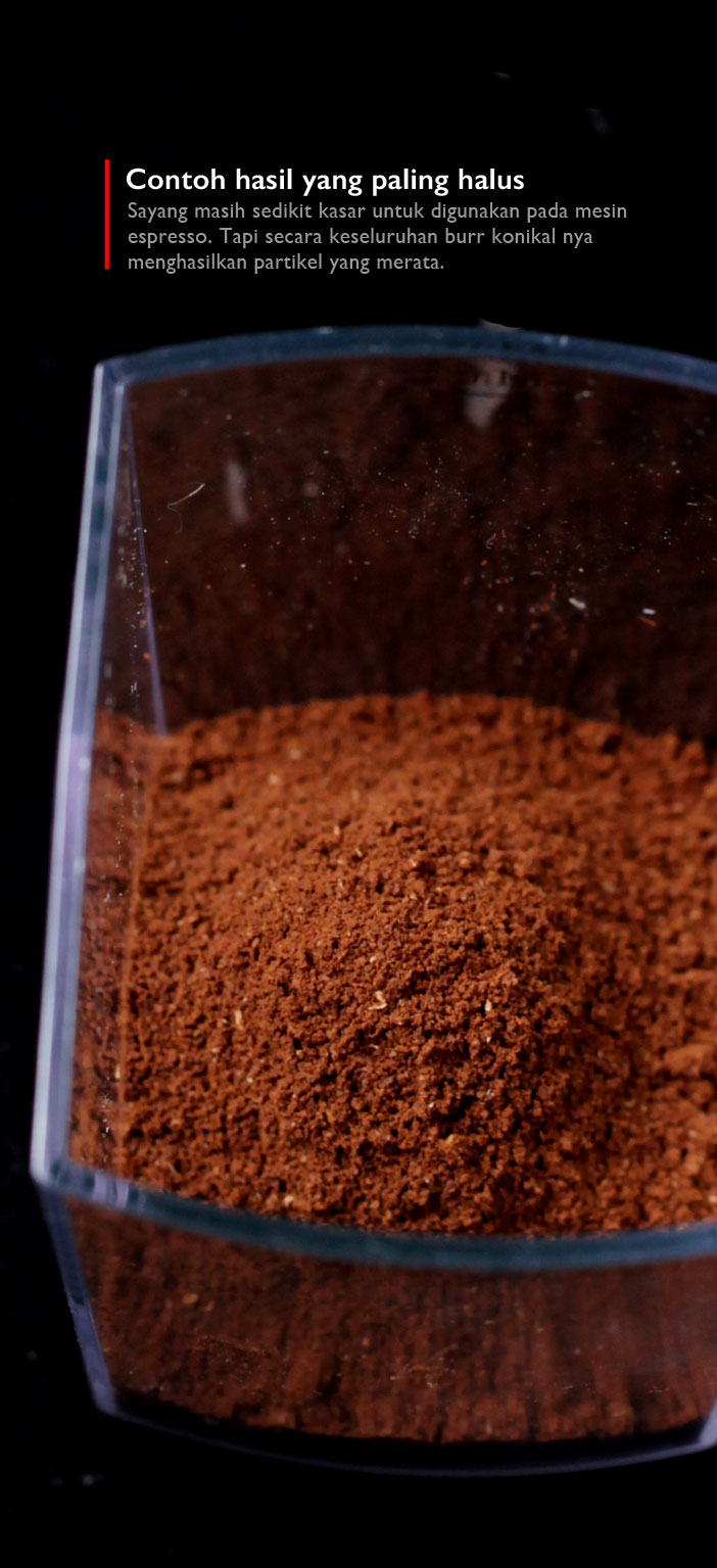 Hal positif lain yang bisa saya tambahkan adalah penampung kopi atau doser yang minim statik, atau hanya sedikit kopi yang menempel di bagian dalamnya.