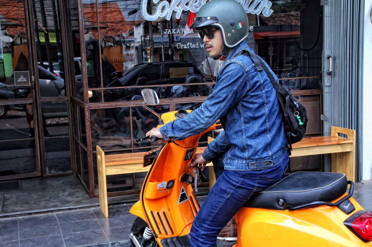 Muhamad Aga dan motor klasik. Tak perlu saya kenalkan lebih jauh dengan Aga, sebagaimana biasa ia dipanggil yang kini mengelola Coffee Smith di Jakarta. Pemilik 3 motor dari mulai Vespa Piaggio S 150, Honda CB 100, dan sebuah Yamaha Scorpio yang sudah ia sulap menjadi caferacer.