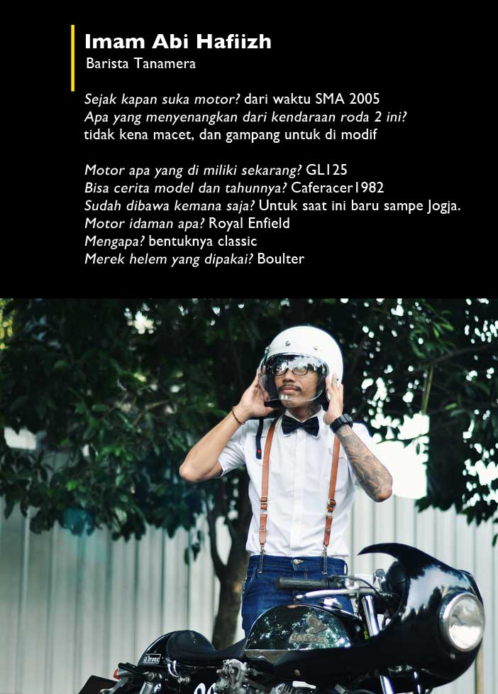 Viki dan Mirza dengan Vespa. Barista Tanamera, Viki Raharja (27) yang juga merupakan lulusan sekolah Nuklir ini adalah pengendara Vespa yang persaudaraan di antara sesama pengendaranya sudah terkenal. Jangan kawatir bila Vespa tua Anda mogok di tengah perjalanan karena selalu ada pengendara Vespa lain yang dengan senang hati menyingsingkan lengan baju untuk mencoba membantu. Sebuah solidaritas yang tak kenal batas seperti ini sudah terbentuk dengan sesama pengendara skutik Italia ini dan itu salah satu alasan Viki memilih tipe kendaraan ini selain menyenangi motor klasik seperti Honda CB.