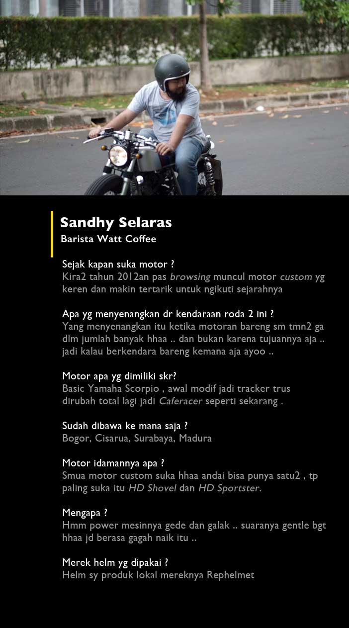 Cobalah tanya kepada para pengendara motor yang enggan melepaskan roda duanya, apa sih enaknya mengendarai mesin beroda dua ini. Mungkin banyak alasan yang mereka kemukakan sulit untuk diterima. Tapi buat pengendara motor, kendaraan ini seakan sudah menjadi belahan hati, “teman hidup” yang kegiatan membersihkannya pun sudah menjadi ritual yang tak boleh diganggu. Sebuah tunggangan yang sudah membawa pengendaranya menyusuri setiap jengkal aspal hingga jauh ke pelosok yang tak bisa ditempuh dengan kendaraan jenis lain. Tulisan kali ini akan mengangkat para Barista yang sekaligus merupakan para pengaspal jalan dengan kendaraan roda dua kebanggan mereka masing-masing.