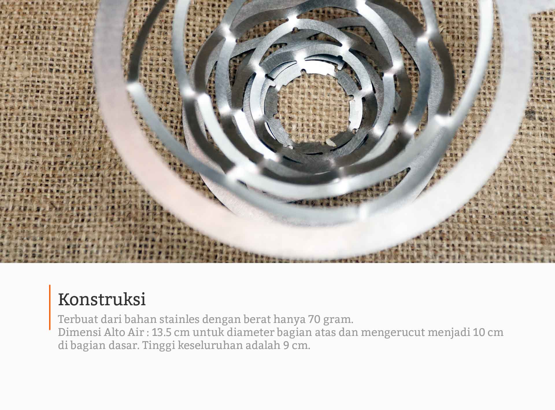 Terlepas bahwa menyeduh kopi dengan alat ini yang diklaim akan meningkatkan ekstraksi, Alto Air adalah produk yang atraktif bila dilihat dari keseluruhan desainnya. Beratnya hanya 70 gram dengan material dari stainless yang terdiri dari 2 bagian, bagian dasar atau tatakan dan kerucut tepat meletakan filter.
