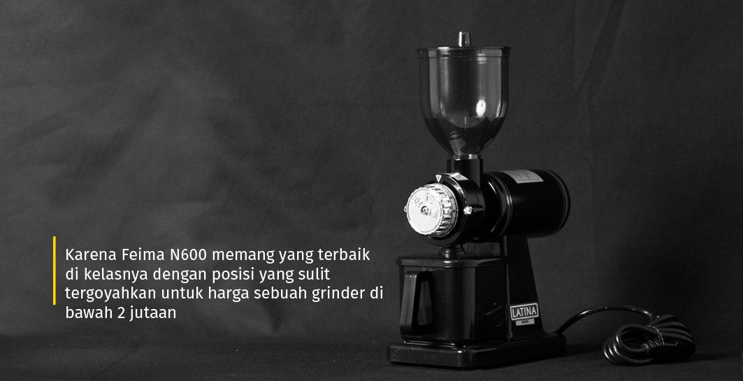 Grinder sapu jagat yang bisa menghasilkan bubuk kopi halus untuk mesin espresso, apalagi untuk seduh biasa. Harga sekita 1.8 jutaan, dan Anda bisa membaca kembali ulasan saya tentang Latina di artikel : Terbaik : Feima N600 a.k.a Latina Latina.