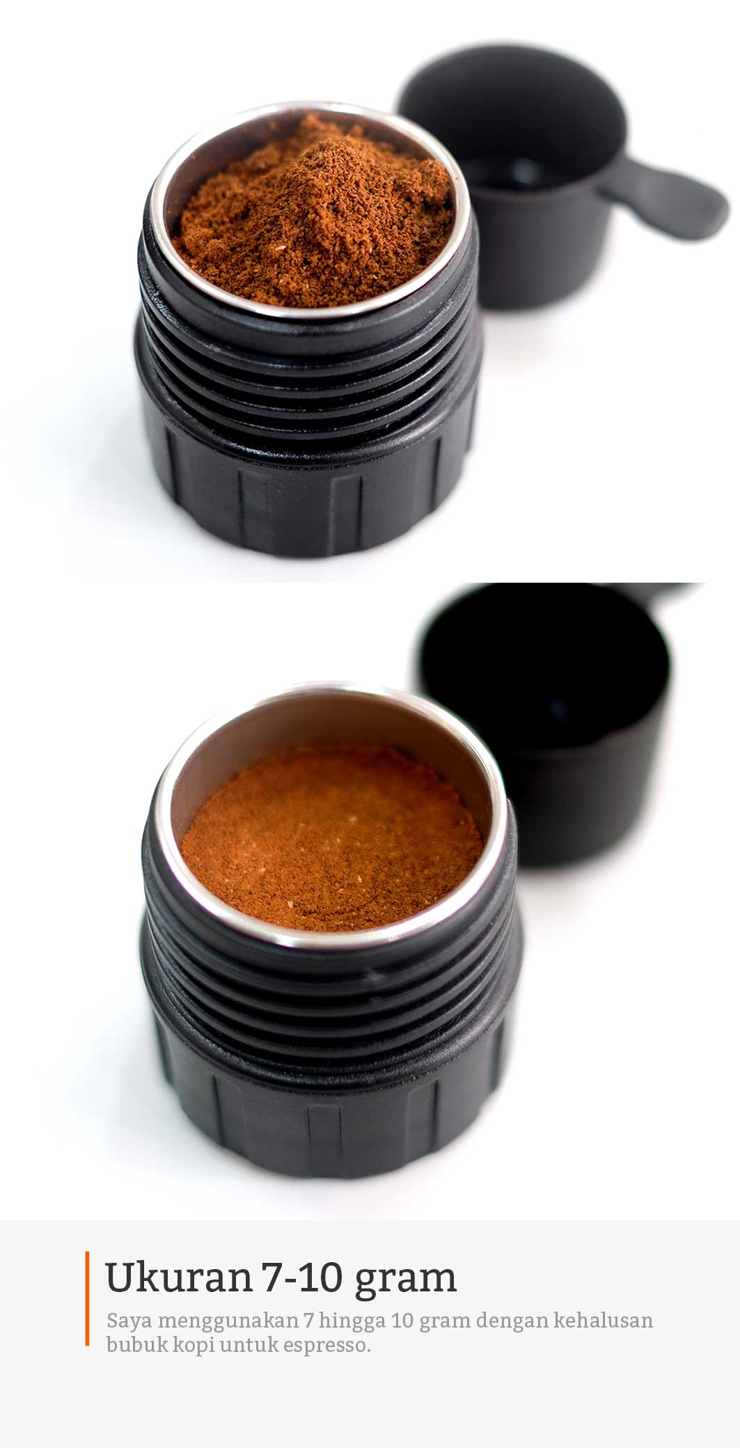 Setelah digiling, kopi dimasukan ke dalam basket lalu dipadatkan dengan bantuan sendok kopi yang sudah disediakan. Seterusnya tinggal memasukan air panas dan putar penutupnya untuk bersiap melakukan ritual menekan pompa.