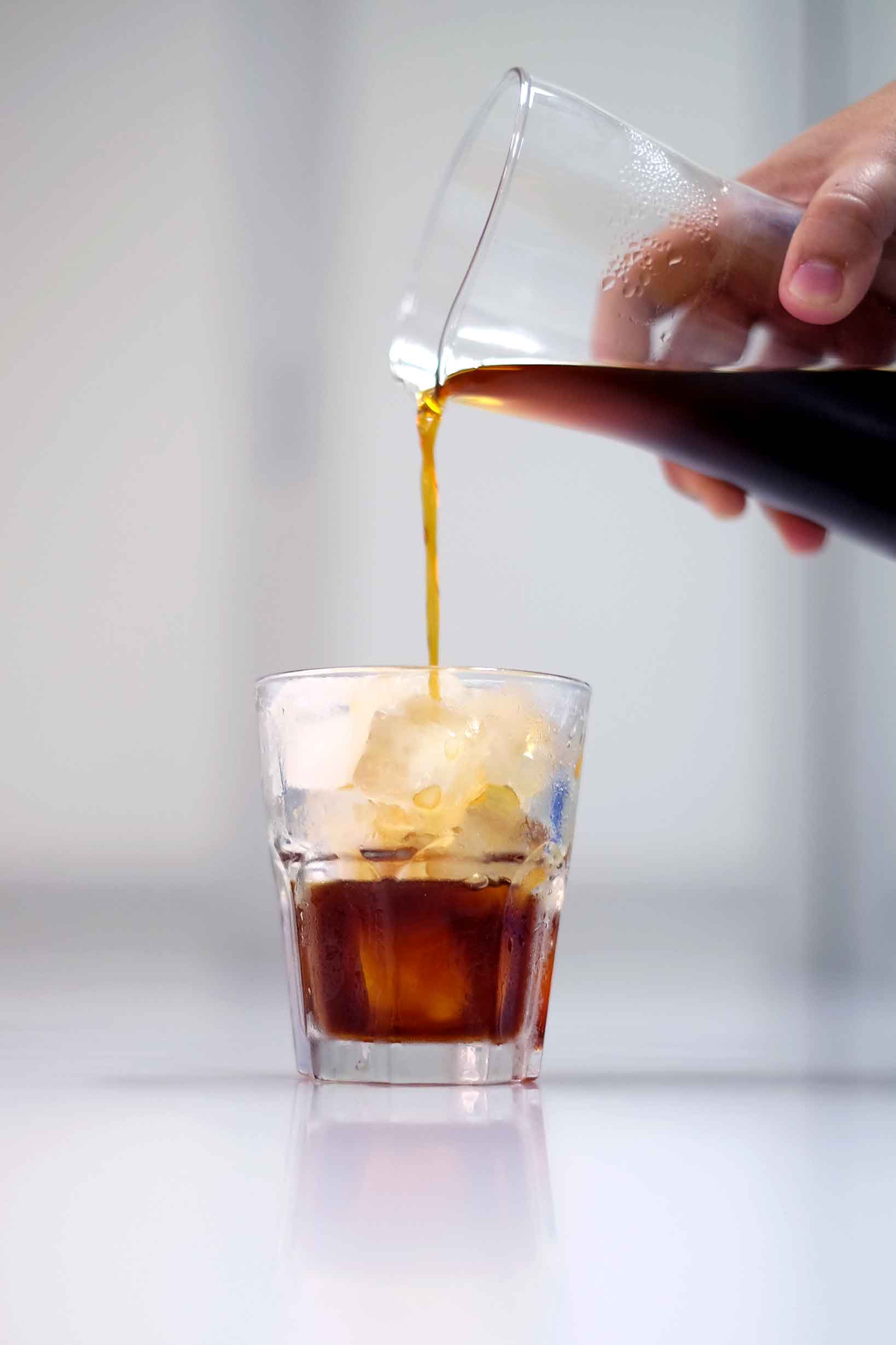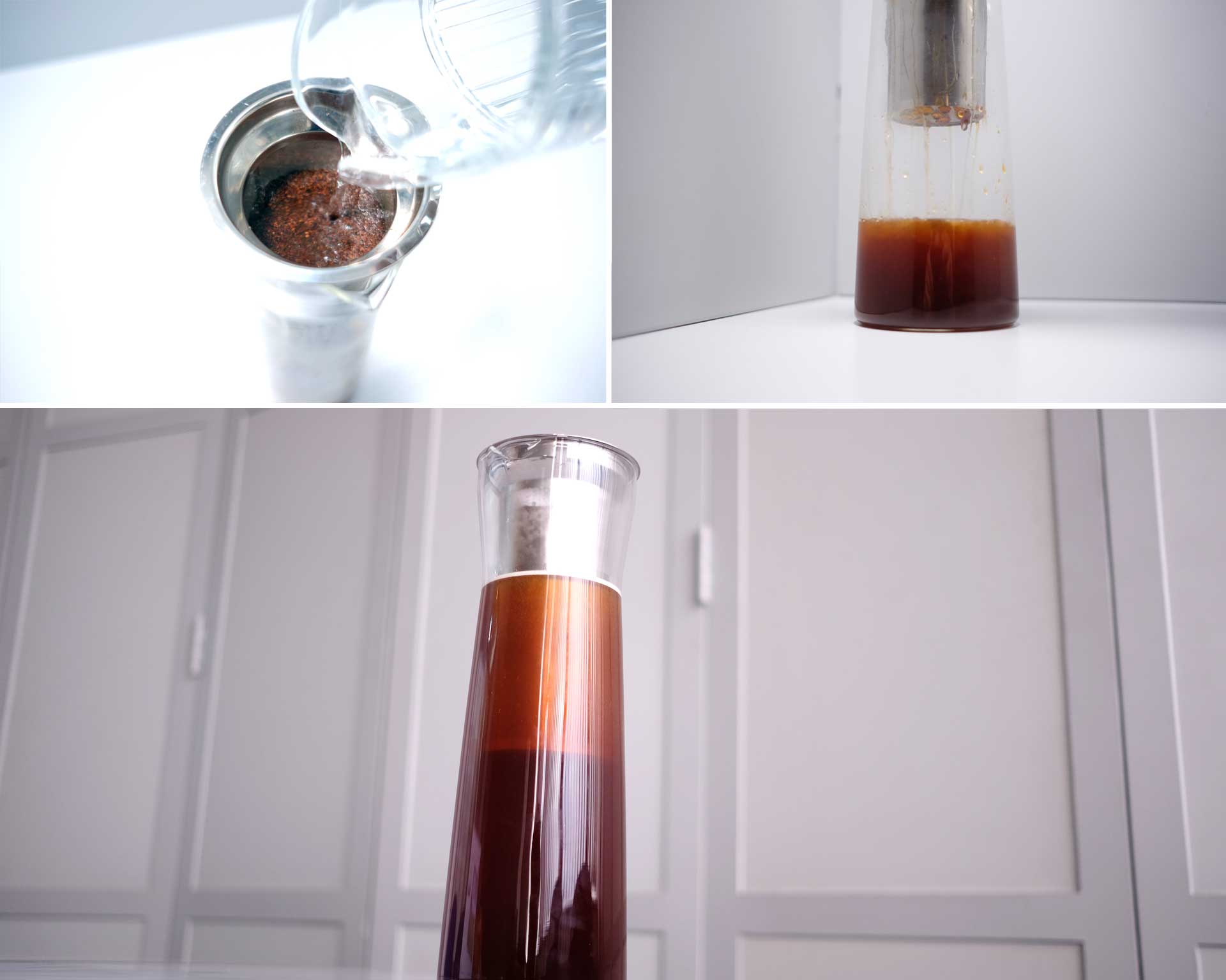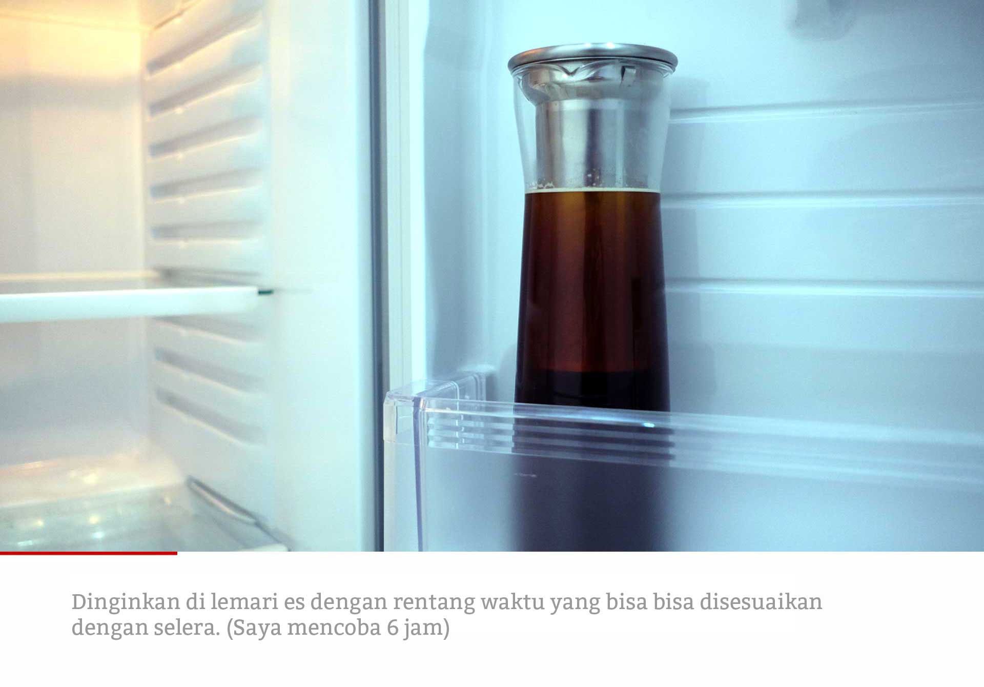 Menggunakan Cold Brew Coffee Jug. Air es atau air biasa ? Salah satu pertanyaan yang sering saya dengar dan demi kepraktisan saya memilih air dengan suhu ruang. Rasionya 50 gram kopi untuk 750 ml air dituang perlahan sambil aduk perlahan hingga selesai. Cuma itu, dan tinggal masukan ke dalam lemari es dengan jangka waktu 6 atau sesuai selera.