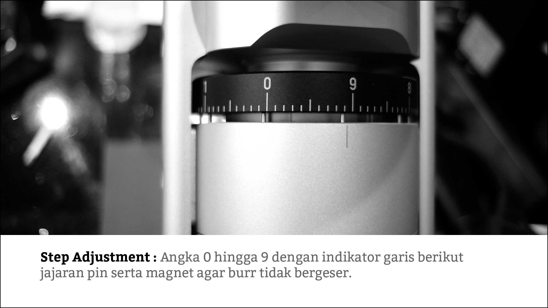 PIN – Step System. Komponen penting ini tepat berada di tengah bagian grinder dengan skala 1 hingga 100 atau menggunakan sistem step. Grinder biasanya rentan dengan perubahan setting, walaupun hanya bergeser sedikit terutama pada saat digunakan untuk menggiling kopi bervolume besar. Pada EG1, keberadaan pin tersebut akan mengunci burr sedemikian rupa untuk menghindari pergeseran sekecil apapun. Sebuah fitur yang sangat berguna dari sebuah komponen sekecil pin yang berukuran 5 mm.