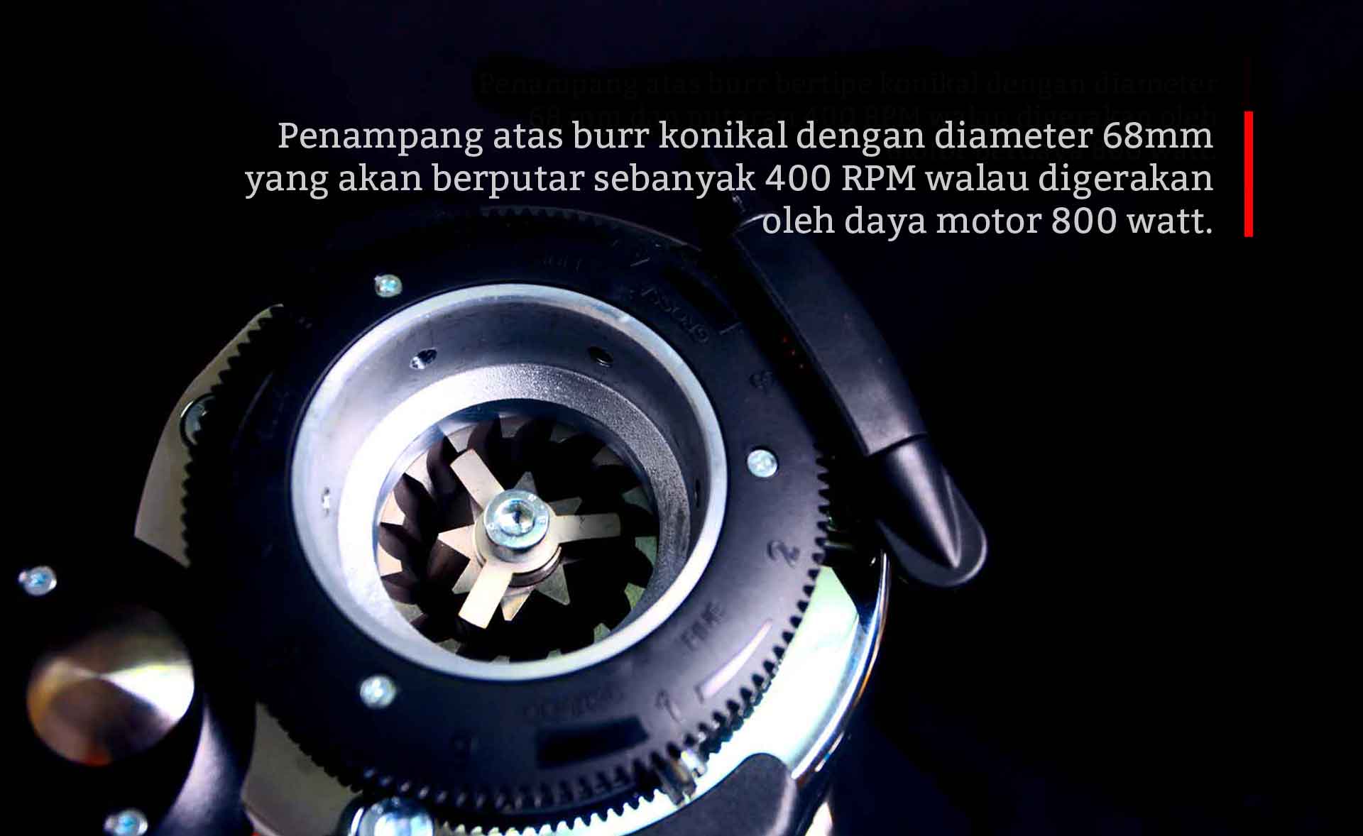 RPM dan Diameter Burr. Walau berdaya listrik 800 watt, putaran motor didesain hanya 400 RPM atau hampir sama dengan Mazzer Kony yang juga mengadopsi motor putaran rendah yakni 420 RPM. Namun burr Kony lebih kecil 5cm dibanding dengan M7D yang berdiameter 68 mm.