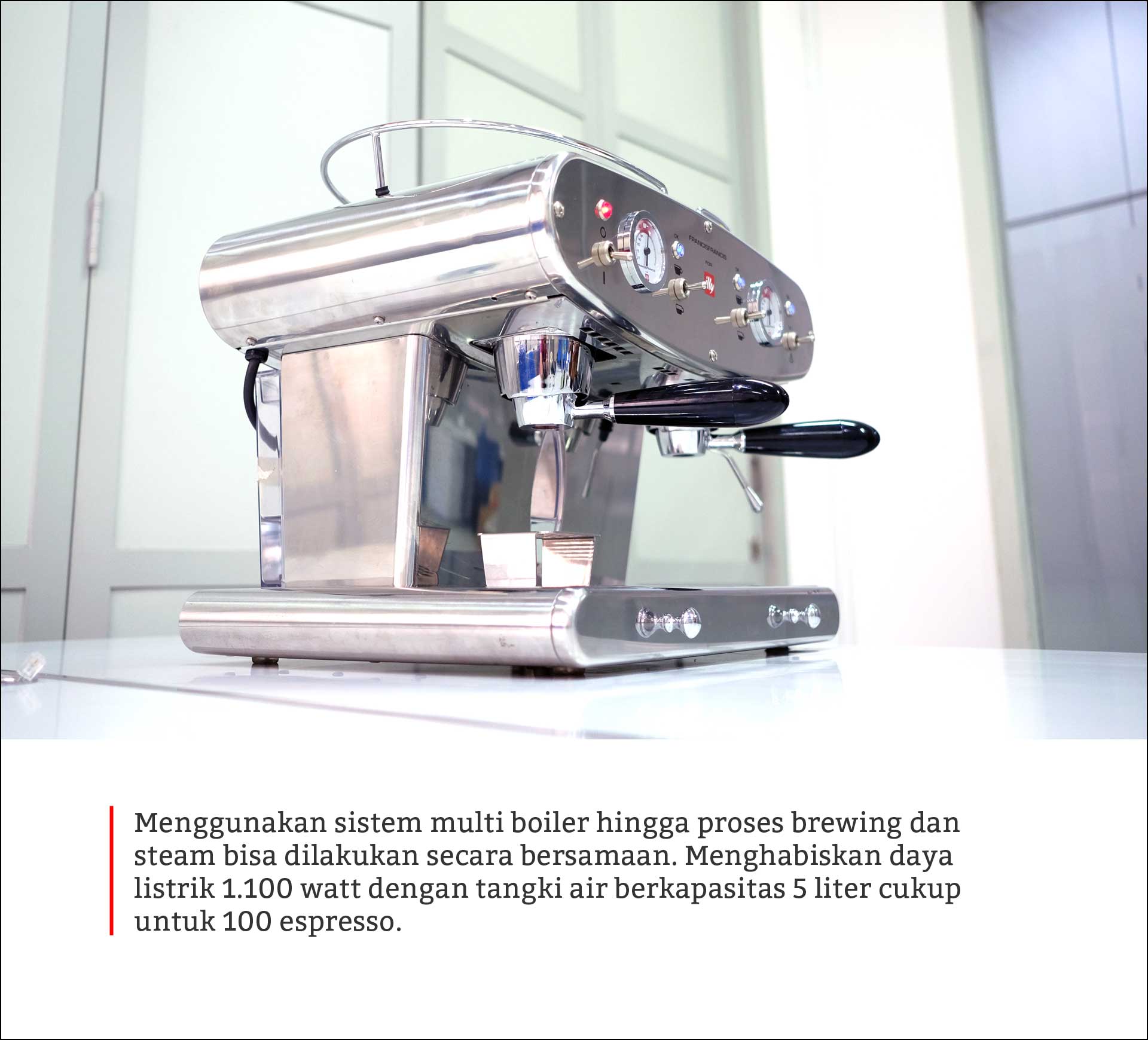 Walau hanya dipasok daya listrik 1.100 watt, mesin yang menggunakan boiler terpisah ini hanya memerlukan waktu sekitar 2 menit untuk siap digunakan. Kapasitas tangki yang 5 liter cukup untuk 100 espresso dengan tekanan pompa 15 bar.