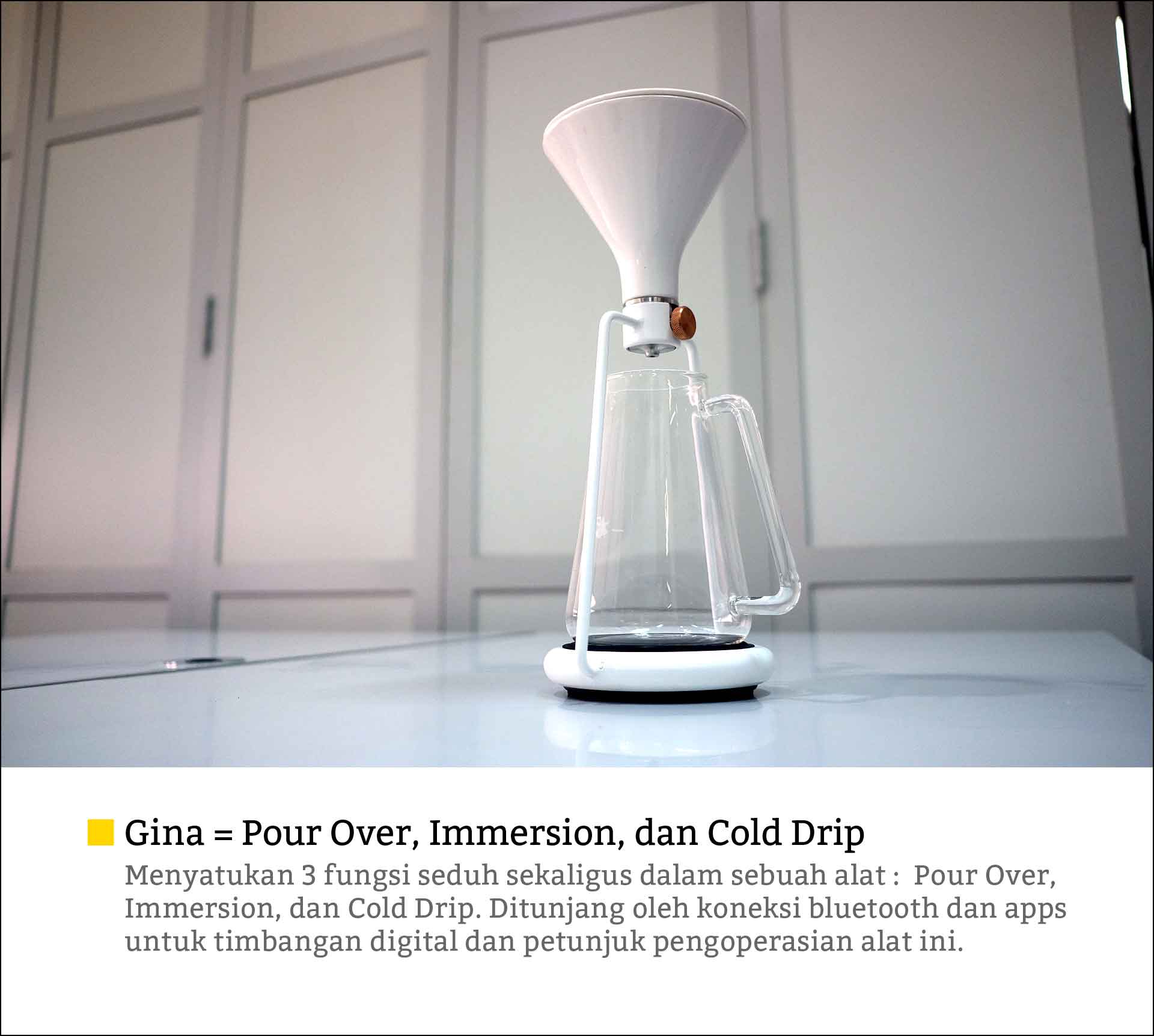Tiga Cara Seduh. Bagi yang lebih memilih cara seduh dengan membiarkan kopi berendam atau immersion seperti pada French Press, atau yang lebih menyukai pour over, hingga ingin kopi tanpa diseduh air panas dan dibiarkan menetes berjam-jam untuk cold drip, kesemuanya bisa diakomodasi oleh Gina.
