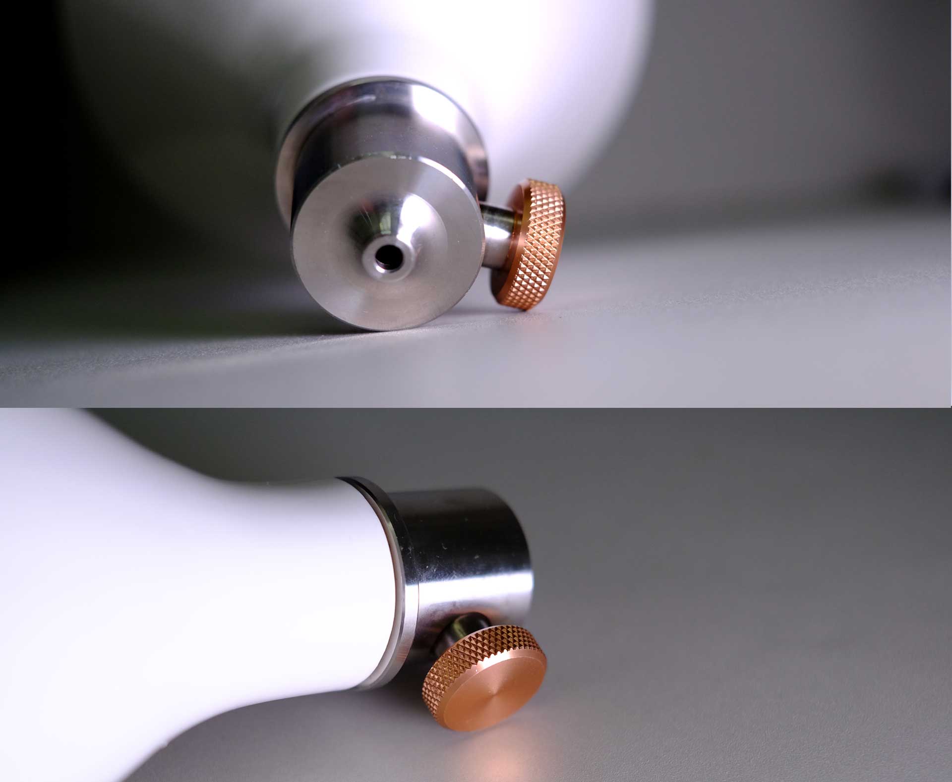 Di bawahnya terdapat tombol putar berwarna tembaga untuk mengatur seberapa besar aliran air, juga dengan material baja yang solid dan mudah untuk diputar ke kiri untuk membuka atau kanan saat menutup. Demikian juga dengan bagian filter yang difungsikan untuk “cold drip”, serta decanter gelas dengan kapasitas 473 ml / 16 oz (batas pembuatan cold drip), dan 800 ml liter untuk batas maksimal (pour over/immersion).