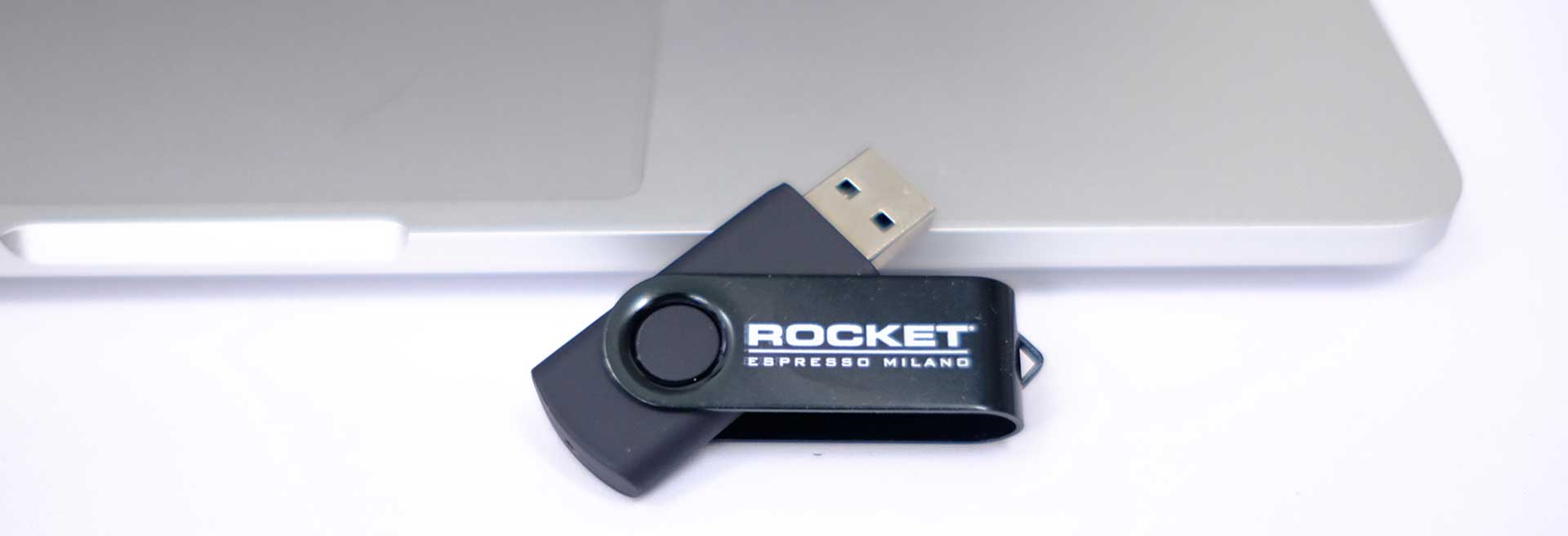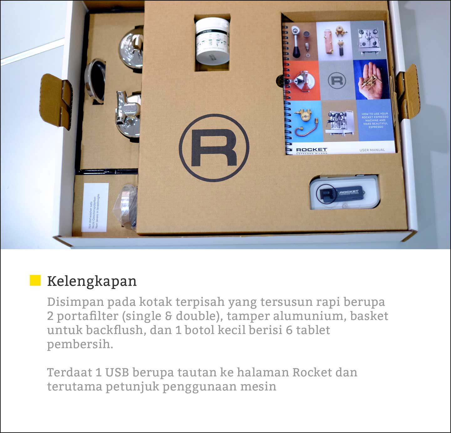 USB. Terakhir sebuah USB yang berkapasitas 528.5 MB dan berisi tautan ke halaman Rocket (tanpa harus ada koneksi internet) yang salah satu halamannya merujuk kepada cara membuat espresso hingga perawatan mesin.