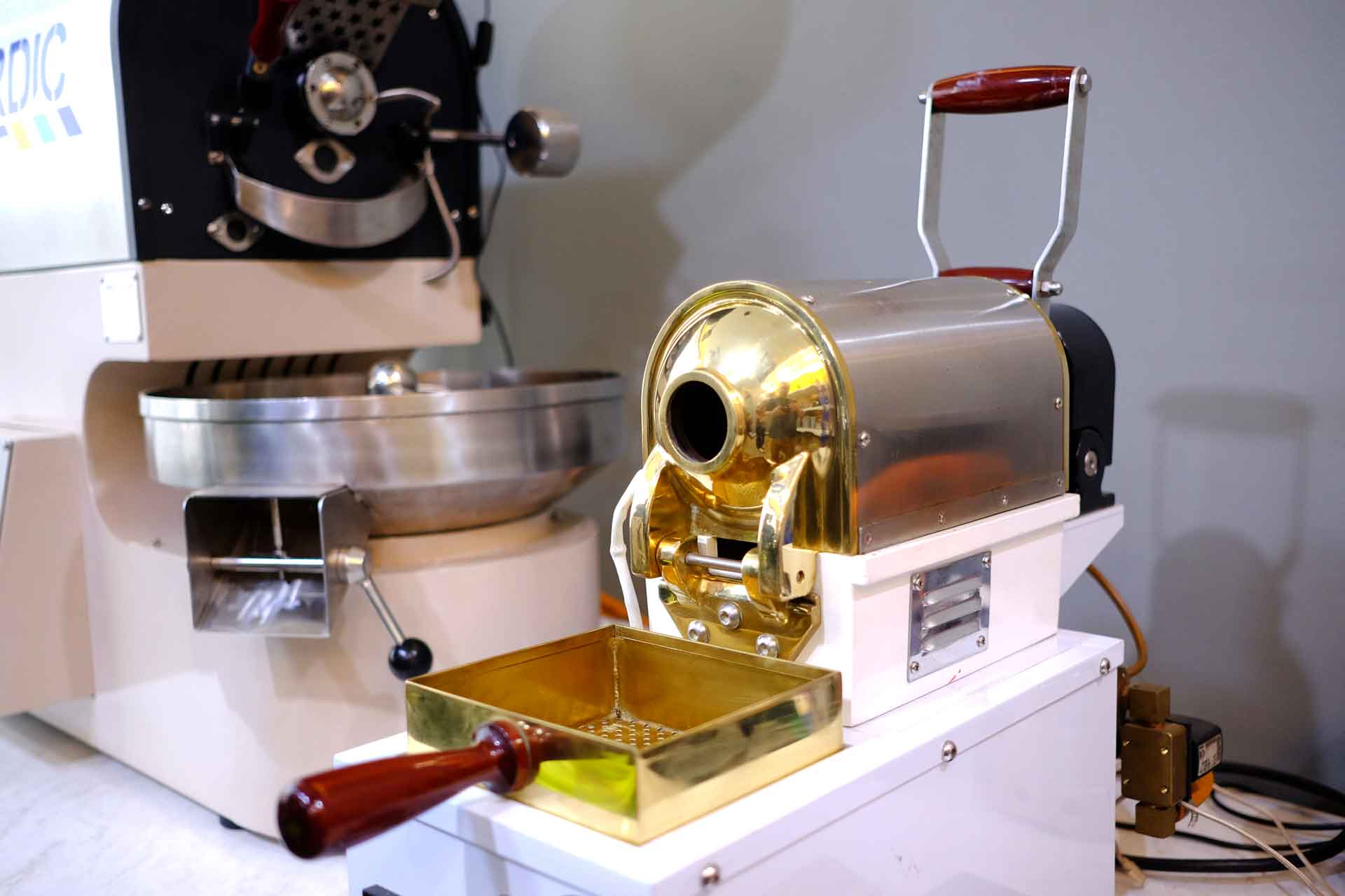 Sample Roaster. Tabung atau barrel yang berwarna emas adalah salah satu produk dari VNT yang menarik perhatian dan menjadi salah satu alat roasting kopi yang diperagakan di kantor mereka di kawasan Meruya, Jakarta Barat, tepatnya di Rukan Grand Aries Niaga Jl. Taman Aries Blok E1 no.1T.