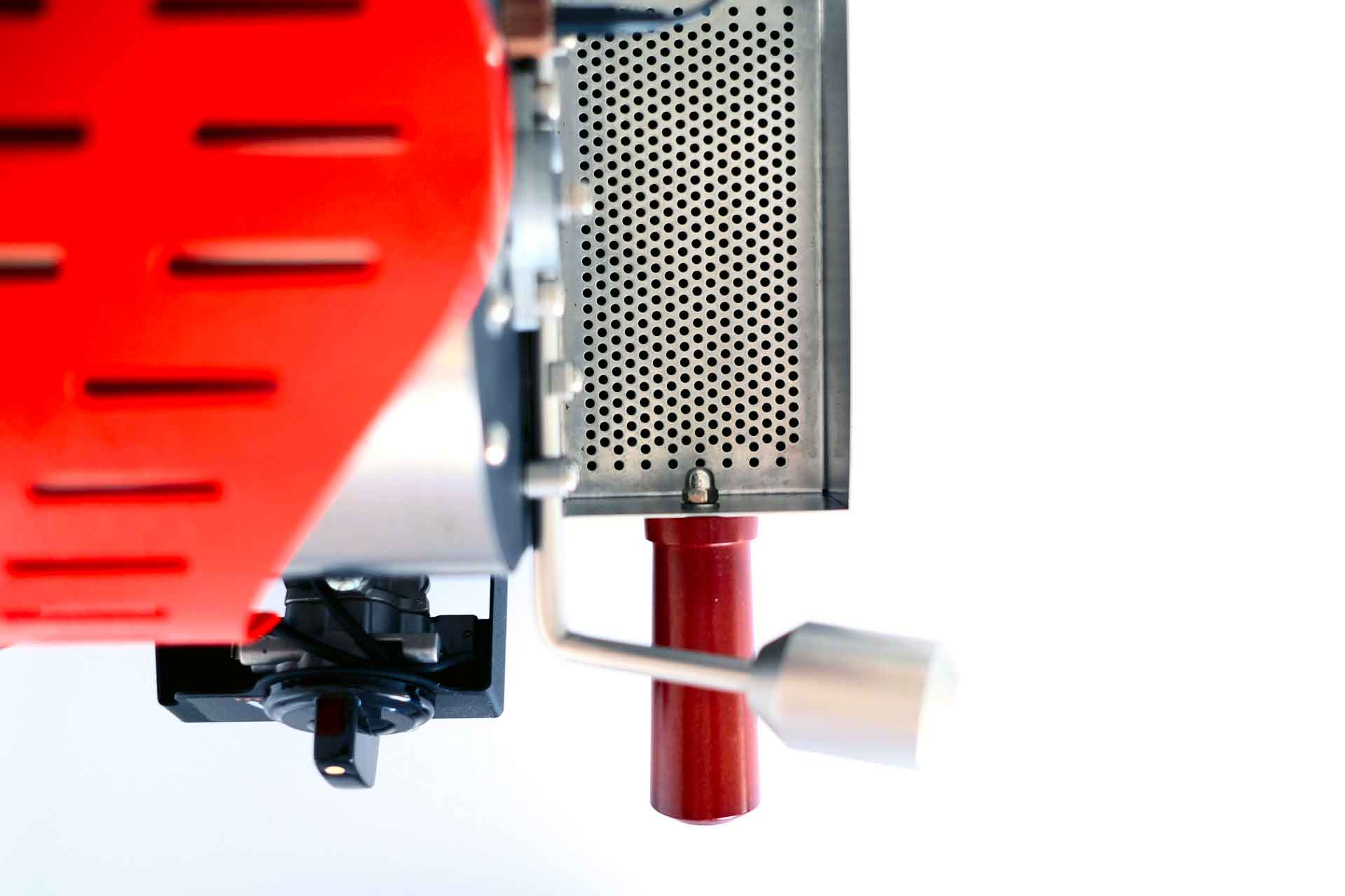 Panel Depan. Akses untuk memasukan biji kopi terdapat di panel depan serta sebuah pengukur suhu digital untuk biji kopi melalui probe yang diarahkan ke dalam bagian drum.