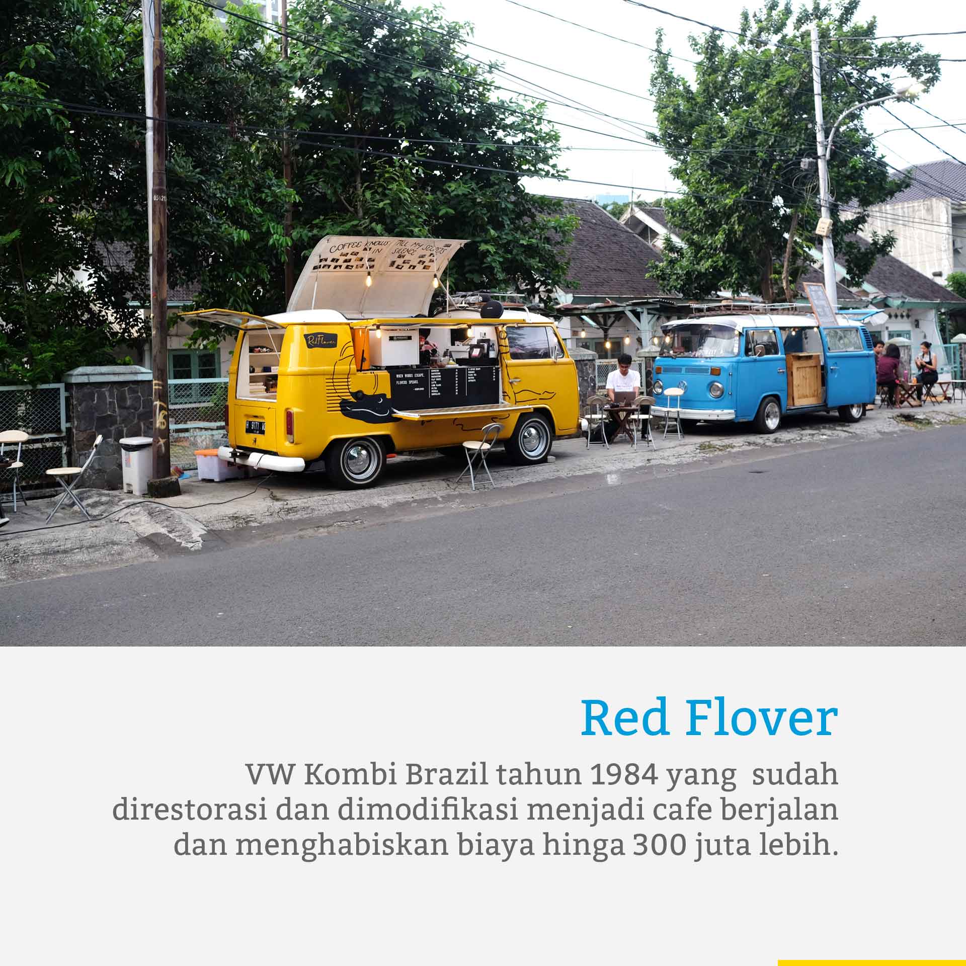 Red Flover dan Kombi 1984. Setelah melalui banyak permenungan, VW Kombi menjadi pilihannya dan berhasil meminang mobil impiannya seharga 30 juta untuk dijadikan lapak berjualan kopi dan bukan “cubanos” sebagaimana yang dilakukan oleh para pemain film “Chef”.