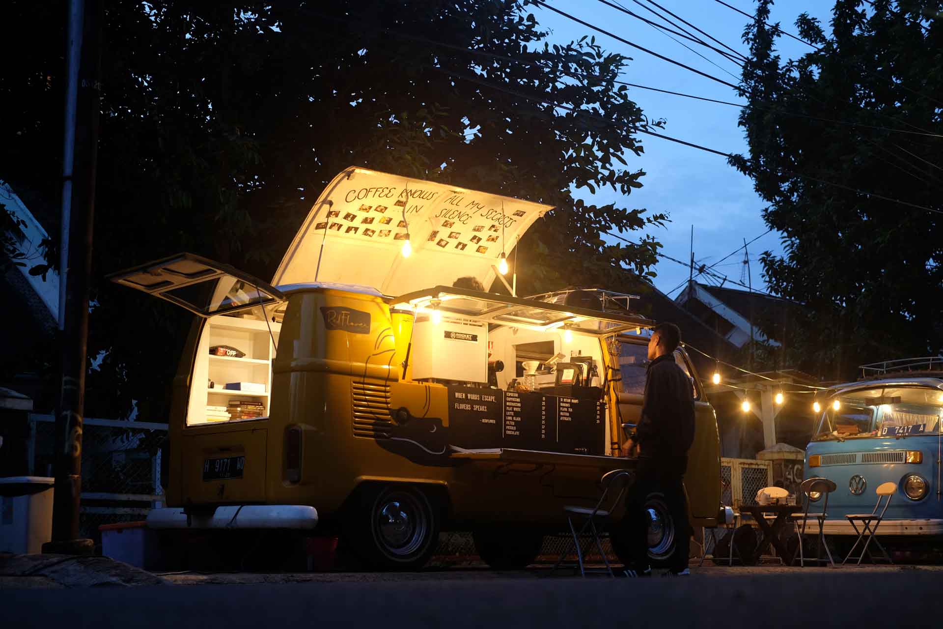 Kombi. Menggunakan VW Kombi untuk berjualan kopi ataupun makanan sudah merupakan hal yang lumrah. Mobil ini memang punya dimensi yang cocok untuk diajak sebagai teman seperjuangan mencari nafkah. Ruang interiornya yang luas membuat modifikasi bisa dilakukan sedemikian rupa untuk bisa mengangkut berbagai peralatan yang diperlukan.