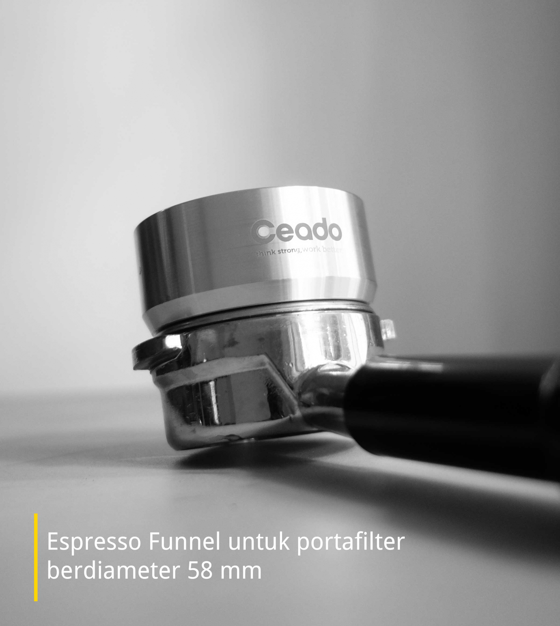 Funnel. Pada Ceado E37SD pabrikan memberikan sedikit ruang untuk memasukan kopi atau funnel yang bisa ditekan-tekan untuk menghasilkan udara guna mengusir sisa kopi yang masih menempel di ruang giling.