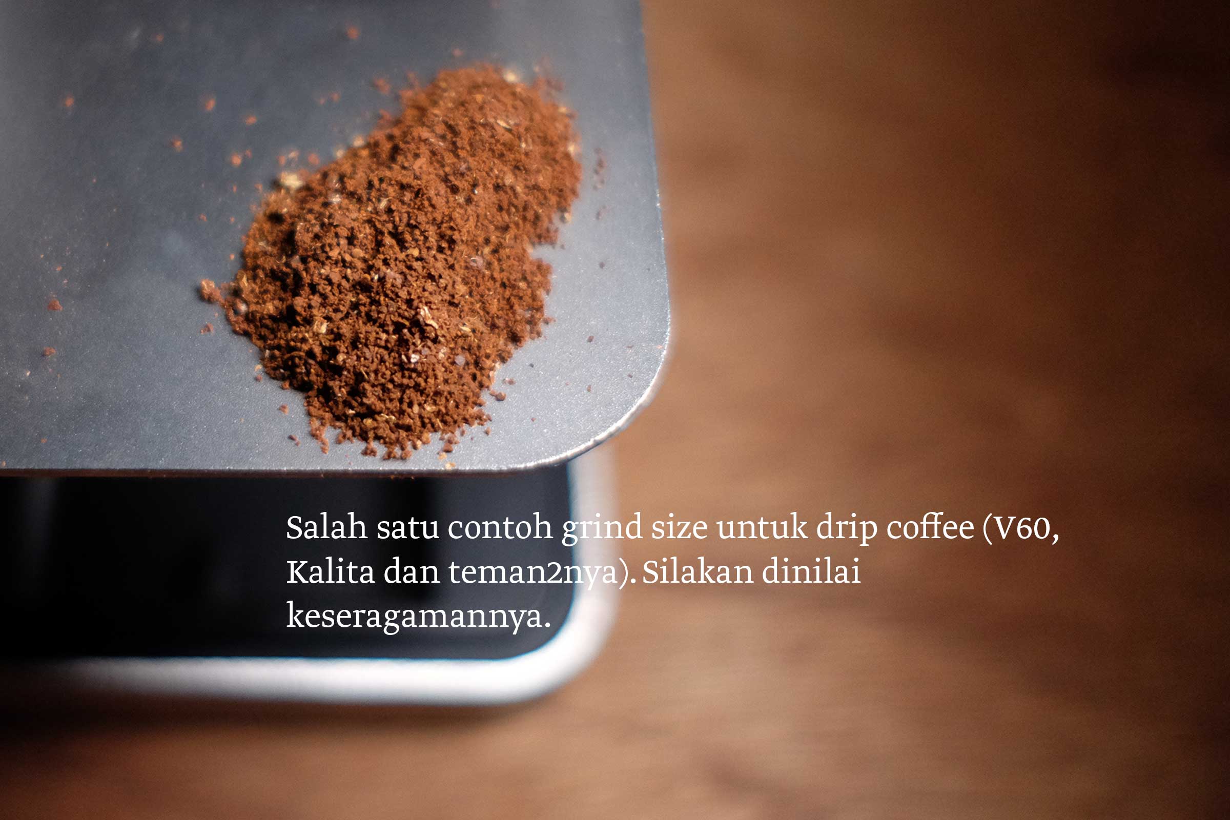 Menggunakan HeyCafe H1. Sebagaimana pembaca bisa melihat pada salah satu foto di atas, grinder ini menyediakan semua pilihan cara seduh kopi, dari yang halus seperti Turkish, hingga paling kasar untuk French Press juga termasuk espresso.